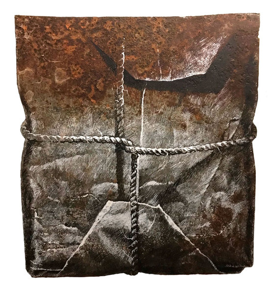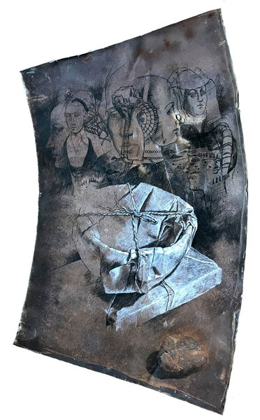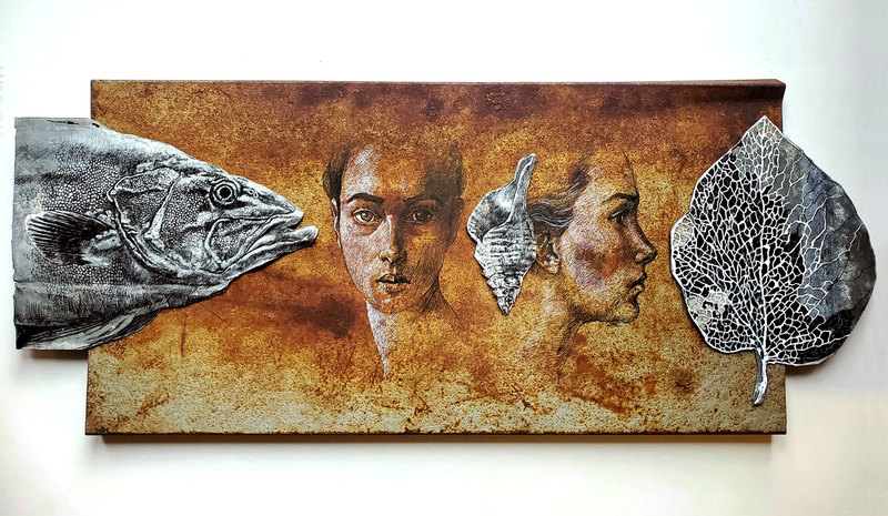 Dem werde ich allmählich gerecht: Erste Arbeiten entstehen - wieder als Mix mit Metall oder mit Zeichnung.