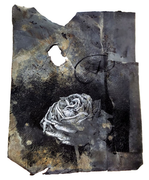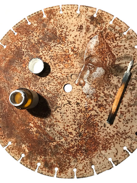 Vieles im Untergrund wird in das Thema miteinbezogen: Angeschweißtes, gerissene Kanten, Löcher und Bohrungen aller Art, Schleifspuren, Farbreste........alles wird in den Prozess miteinbezogen.